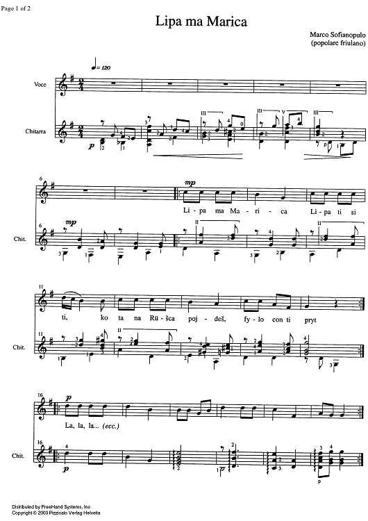 Digital Sheet Music for Lipa ma marica - Score by Marco Sofianopulo scored for Voice/Guitar; id:349607