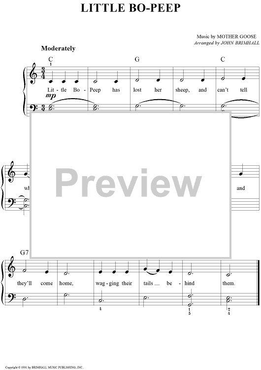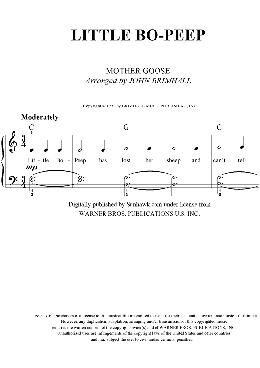 Digital Sheet Music for Little Bo-Peep by John Brimhall, Mother Goose scored for Easy Piano/Vocal; id:252303
