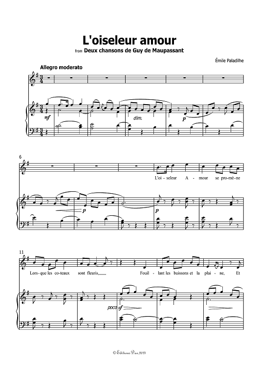 "L'oiseleur amour, from Deux chansons de Guy de Maupassant" Sheet Music by Emile Paladilhe
