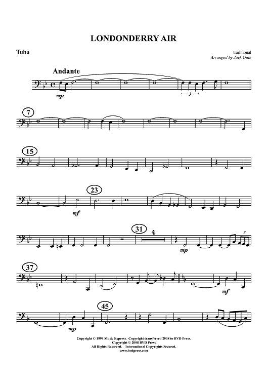 Digital Sheet Music for Londonderry Air - Tuba by Traditional, Jack Gale scored for Brass Quintet; id:405104
