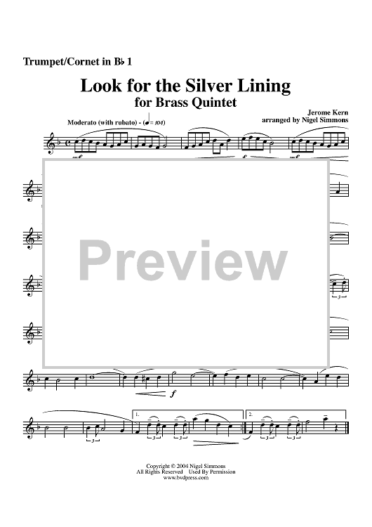 Digital Sheet Music for Look for the Silver Lining - Trumpet 1 by Jerome Kern, Nigel Simmons scored for Brass Quintet; id:311641