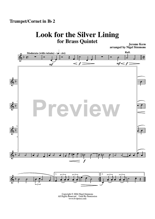 Digital Sheet Music for Look for the Silver Lining - Trumpet 2 by Jerome Kern, Nigel Simmons scored for Brass Quintet; id:311642