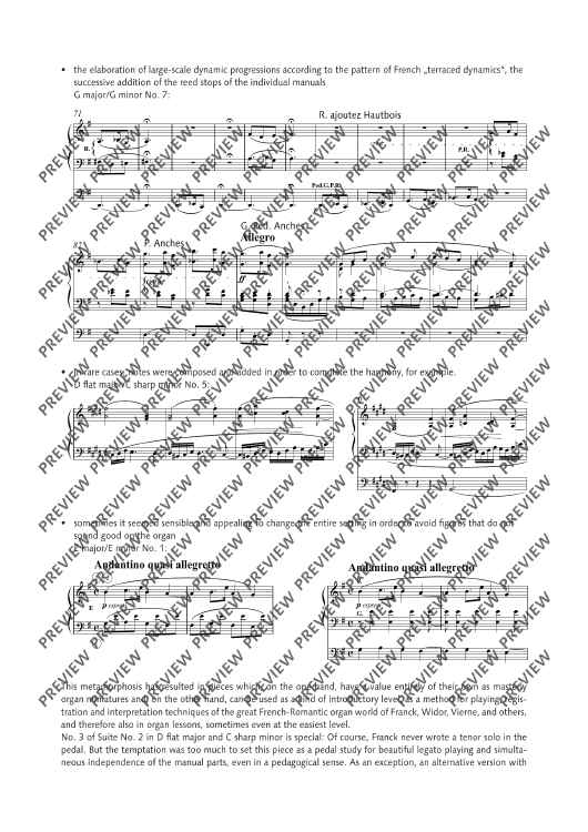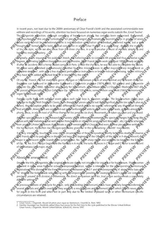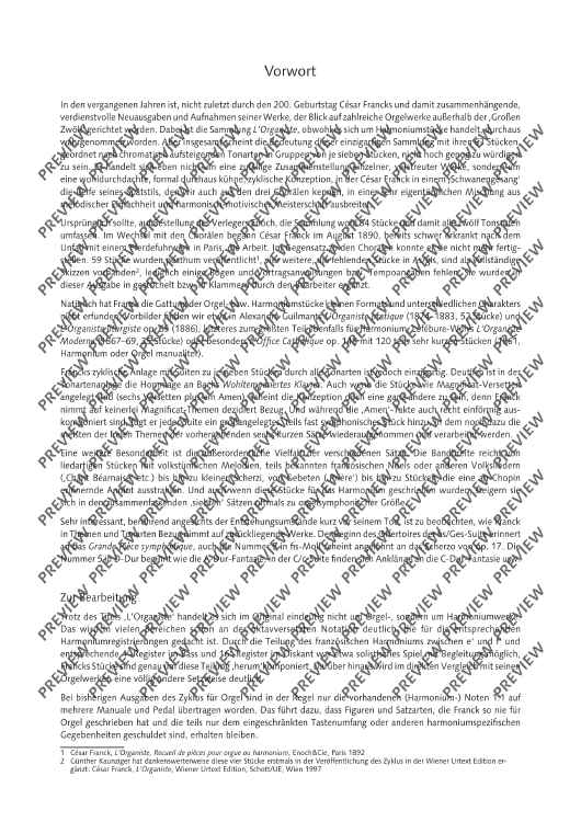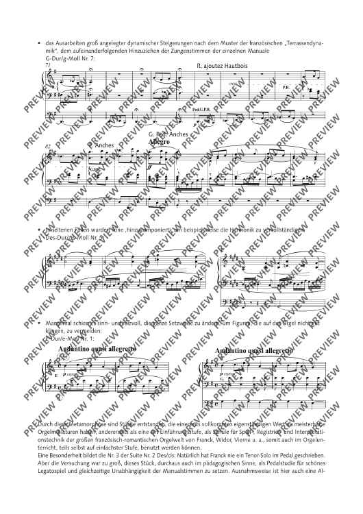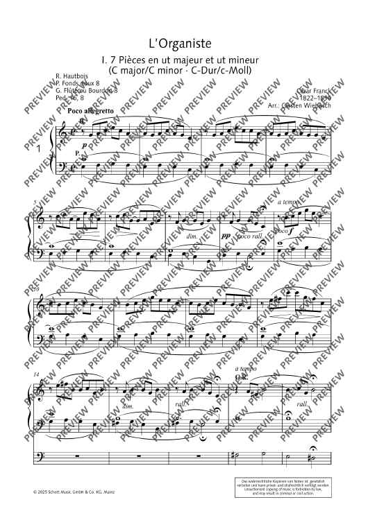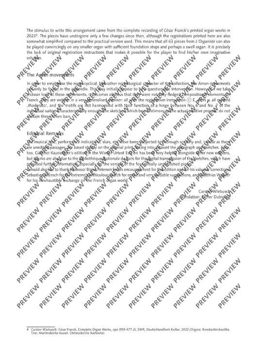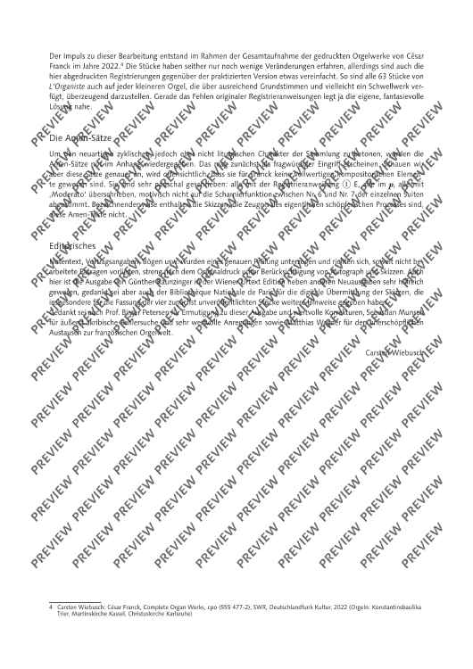 In previous arrangements of the cycle L’Organiste by César Franck, originally for harmonium, the notes have generally been transferred 1:1 to the various manuals and pedals of the organ. Carsten Wiebusch's arrangement, on the other hand, aims to turn the harmonium pieces into real organ pieces. The result is pieces which, on the one hand, have a completely independent value as masterful organ miniatures and, on the other hand, can be serve as a guide for playing, registration and interpretation techniques of the great French Romantic organ world, and thus also in organ lessons.