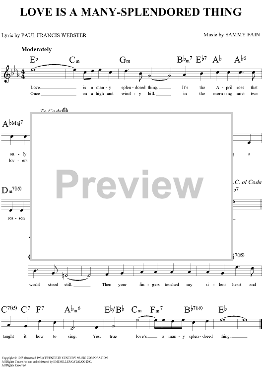 Digital Sheet Music for Love is a Many-Splendored Thing by Sammy Fain, Paul Francis Webster scored for Lead Sheet; id:112275