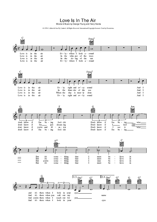 Digital Sheet Music for Love Is In The Air by Harry Vanda, George Young, John Paul Young scored for Lead Sheet; id:401851