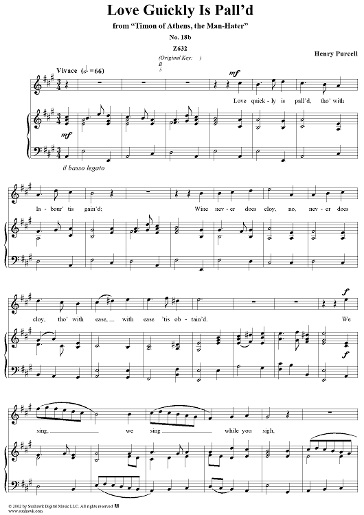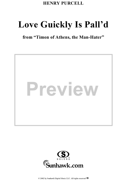 Digital Sheet Music for Love quickly is pall'd, from Timon of Athens, the Man-Hater (masque) by Henry Purcell scored for Voice/Piano; id:255012