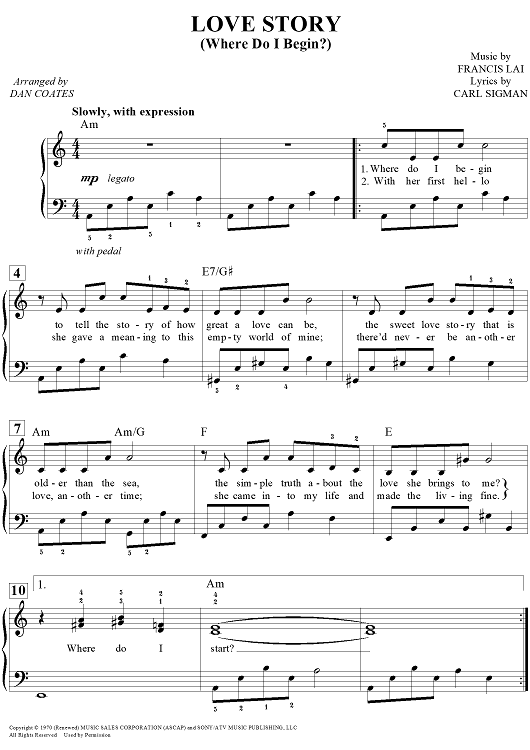 Digital Sheet Music for Love Story (Where Do I Begin?) by Dan Coates, Carl Sigman, Francis Lai scored for Easy Piano/Vocal/Chords; id:450639