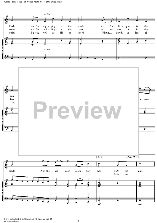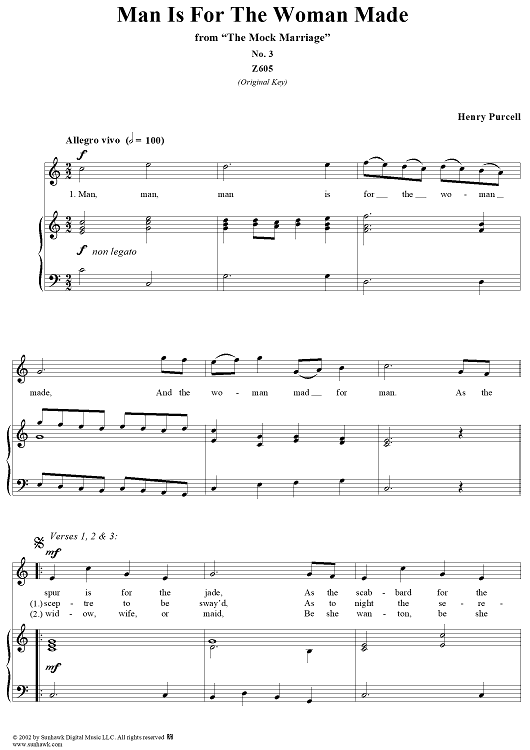 Digital Sheet Music for Man is for the woman made, from The Mock Marriage (incidental music) by Henry Purcell scored for Voice/Piano; id:255050