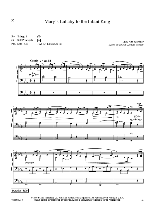 Digital Sheet Music for Mary’s Lullaby to the Infant King by Lucy Ann Warriner, Old German melody scored for Organ Solo; id:437833