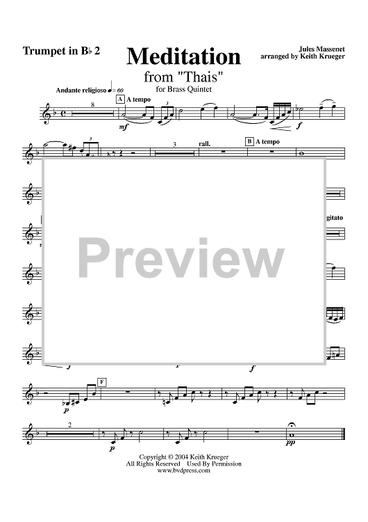 Digital Sheet Music for Meditation from "Thais" - Trumpet 2 by Keith Krueger, Jules Massenet scored for Brass Quintet; id:312733
