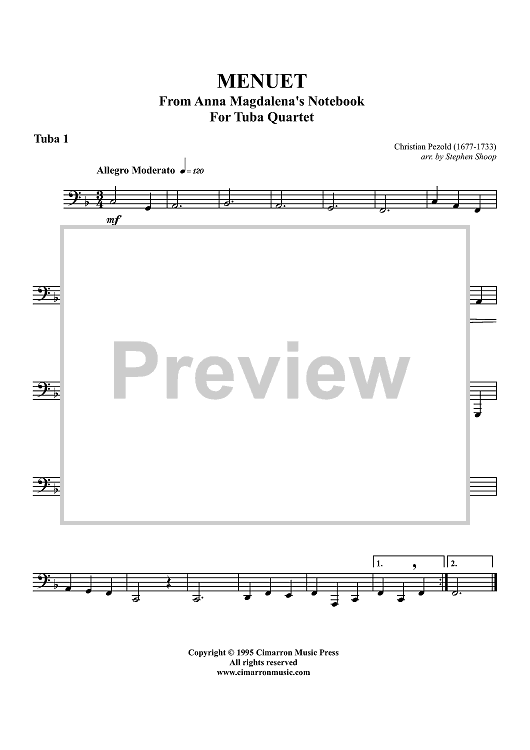 Digital Sheet Music for Menuet from Anna Magdalena's Notebook - Tuba 1 by Christian Pezold, Stephen Shoop scored for Tuba Quartet; id:316069