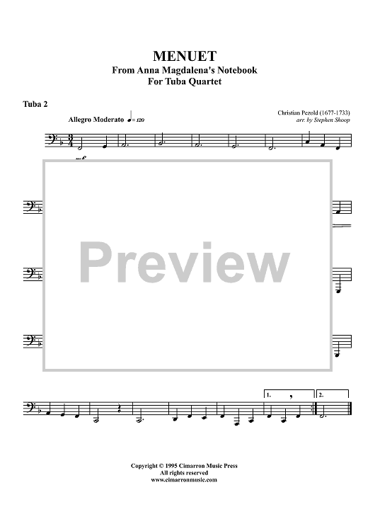 Digital Sheet Music for Menuet from Anna Magdalena's Notebook - Tuba 2 by Christian Pezold, Stephen Shoop scored for Tuba Quartet; id:316070