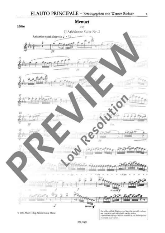 The opera "Carmen", after a short story by Prosper Merimée, and the incidental music to the play „L'Arlésienne" by Alphonse Daudet are without doubt the most important works of Bizet. It is significant for him that his Imagination was aroused most by literary subjects of high Standing. In spite of failure at their first Performances, both works became worldwide successes continuing to our days. The three examples selected here, all of them pieces complete in themselves within the larger framework, are a testimony to the fact that the brilliant orchestrator Bizet had a special predilection for the flute. The opera, in particular, is full of the most beautiful and, for the musician, rewarding, but at the same time very demanding flute passages. In all three pieces, the flute appears in combination with the harp, a pairing created previously by Mozart and other composers. They also have in common that out of the early soloistic duo of flute and harp an orchestra tutti gradually develops in which the flute continues the top part, but shares it with other voices. However, while in the two E flat major pieces (which have some other things in common) the end occurs in a piano, with the two solo Instruments again standing out, there is a single furious crescendo-accelerando in the Danse Bohémienne. Bizet has combined a number of pieces from the incidental music in a suite' in an instrumentally enlarged Version which is now called "L'Arlesienne Suite No 1" "L'Arlesienne Suite No 2" from which the present Minuet is taken was compiled after Bizet's death by his fellow Student E Guiraud (who also wrote the recitatives for "Carmen" which were added later on). The "Bohemian Dance" has little in common with the typical Bohemian idiom. As a concession to public taste it has - from a dramaturgical point of view - fallen into disrepute, not entirely without justification. Its absolute musical worth, however, remains unchallenged. The Instrumentation which grows constantly fuller, beg