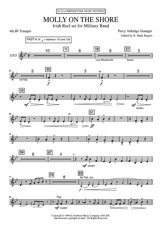 Digital Sheet Music for Molly on the Shore - Bb Trumpet 4 by Percy Grainger, R. Mark Rogers scored for Concert Band; id:503091