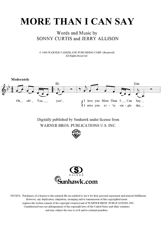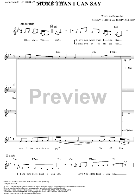 Digital Sheet Music for More Than I Can Say by Sonny Curtis, Jerry Allison, Leo Sayer scored for Lead Sheet; id:271664
