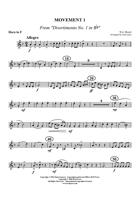 "Movement 1 from "Divertimento No. 1 in B-flat" - Horn" Sheet Music by Wolfgang Amadeus Mozart