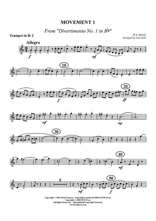 Digital Sheet Music for Movement 1 from "Divertimento No. 1 in B-flat" - Trumpet 2 by Wolfgang Amadeus Mozart, Jack Gale scored for Brass Quintet; id:405108