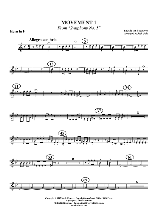 Digital Sheet Music for Movement 1 from "Symphony No. 5" - Horn by Ludwig van Beethoven, Jack Gale scored for Brass Quintet; id:405032