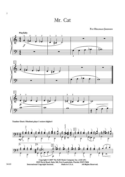 This fun elementary solo depicts the sly and playful nature of a cat named Mr. Cat. The piece contains sharp and flat accidentals in the student part and a spunky teacher duet part.