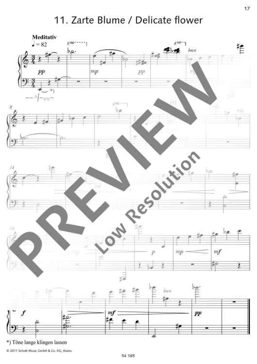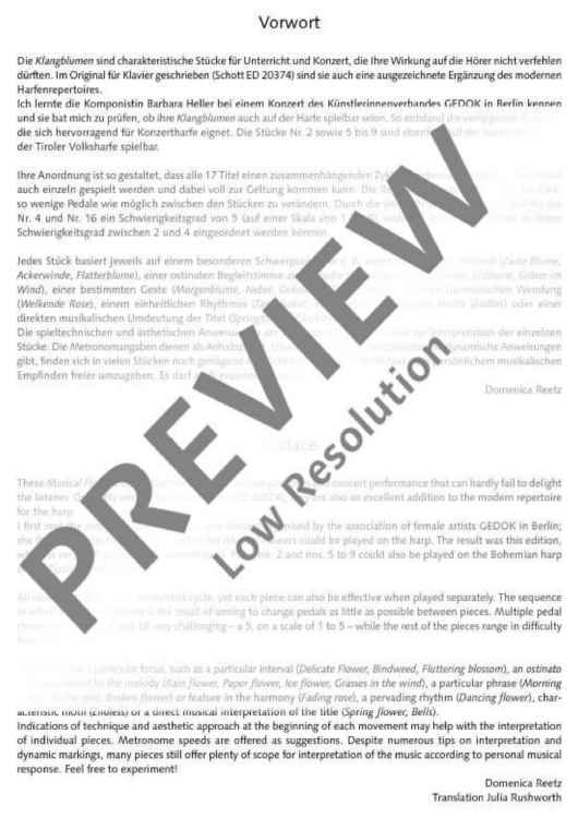 Barbara Hellers "Klangblumen" gibt es neben der Ausgabe für Klavier (Schott ED 20374) und Violine und Harfe (Schott VLB 136) nun auch für Harfe solo. Jedes der 17 Stücke weist einen besonderen Schwerpunkt auf, wie z. B. ein bestimmtes Intervall, eine eigene Spieltechnik, einen charakteristischen Rhythmus oder eine durchgängige Klangfarbe. Die Stücke sind musikalisch anspruchsvoll, aber technisch relativ leicht zu bewältigen. Die Komponistin legt Wert darauf, dass genügend Freiraum bleibt um eigene musikalische Stimmungen einzubauen und den Stücken einen eigenen Ausdruck zu verleihen. Eine Sammlung für Unterricht und Konzert.