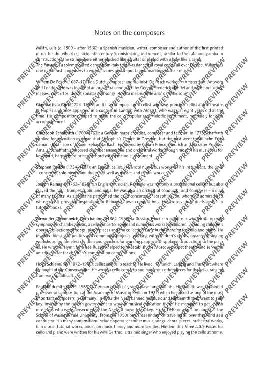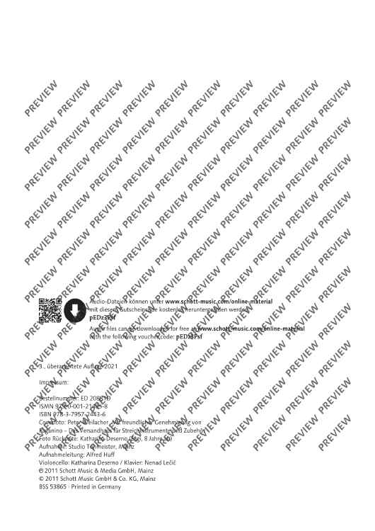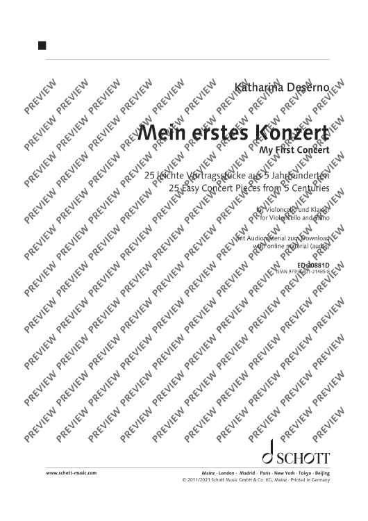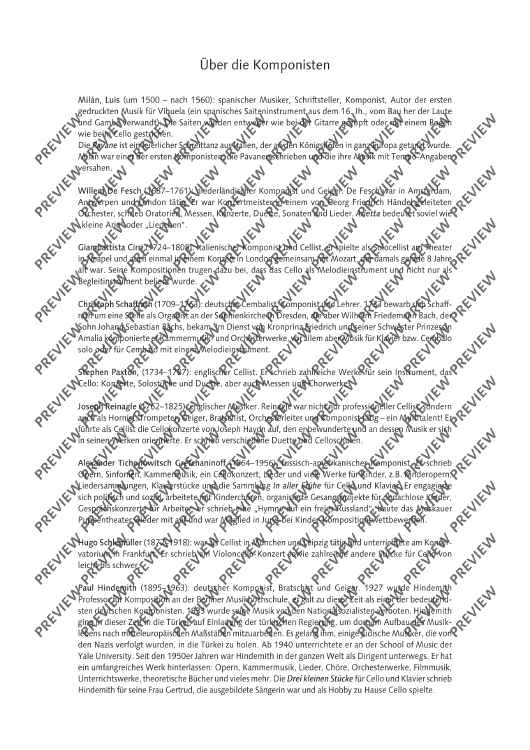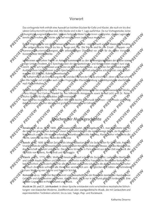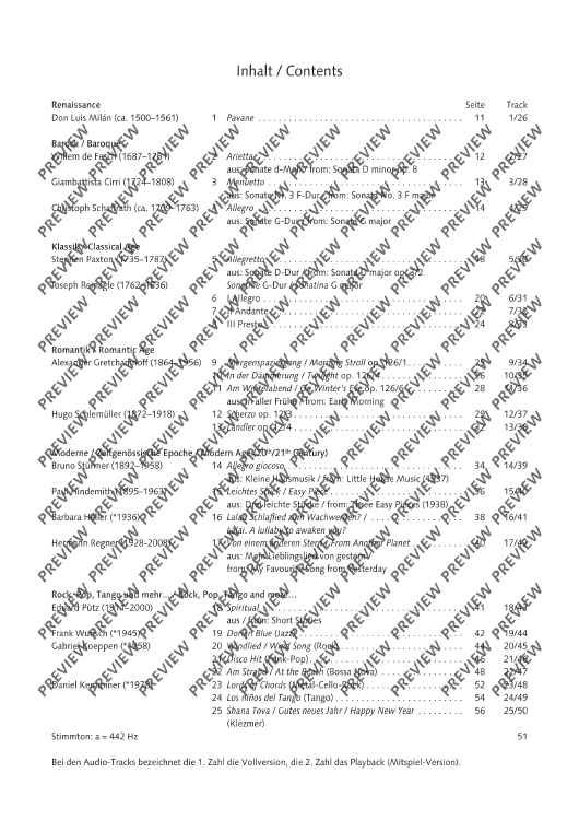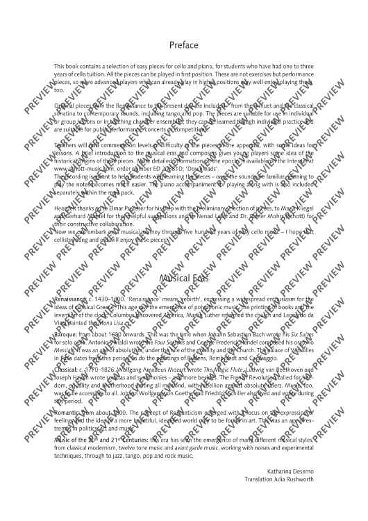 The present volume contains a selection of very easy recital pieces for violoncello and piano which can be played in the first position after 1-2 years of cello lessons. The selected pieces are original works from the Renaissance period to the present day: from the Baroque minuet, the classical sonatina or the Romantic character piece to contemporary music and tango, blues or pop. The pieces are suitable for individual, group and chamber music lessons, for practising on one's own and especially for the first auditions, concerts or competitions. The accompanying CD contains a full version of each piece as well as the piano accompaniment for playing along. The recordings are intended for orientation and for making it easier to learn to play the pieces – for what is already going around in one's head will also be 'in the fingers' much faster. The CD also contains separately the piano part of each piece for playing along. A musical journey through 500 years of cello music!