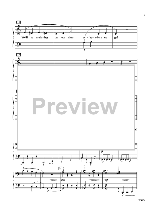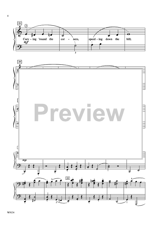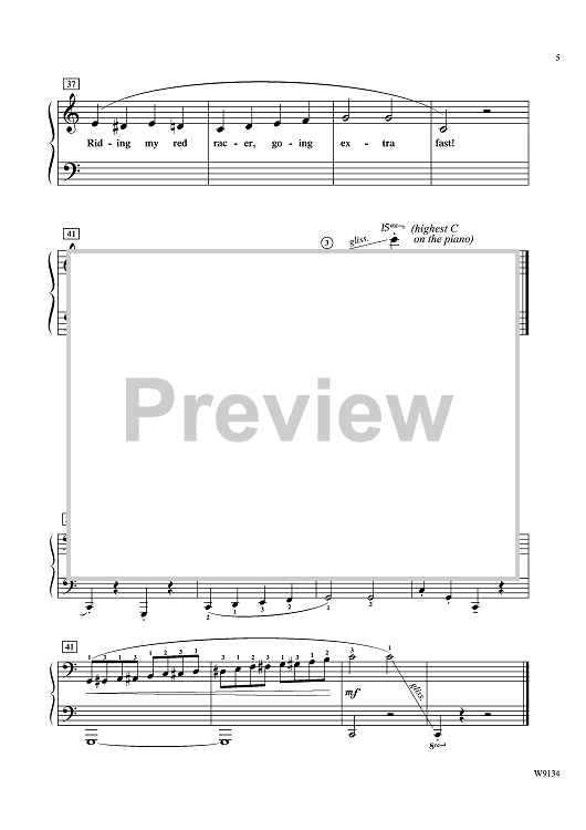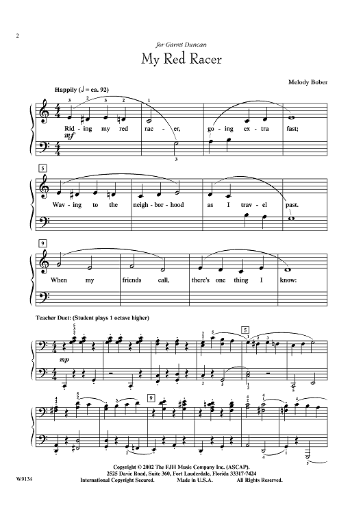 This high-performance piano piece is the perfect vehicle for student motivation. Its irresistible melody (complete with glissandos, hand-crossovers, and moderate use of accidentals) is wonderfully complemented by a teacher duet. With its great lyrics, My Red Racer is an instant classic.