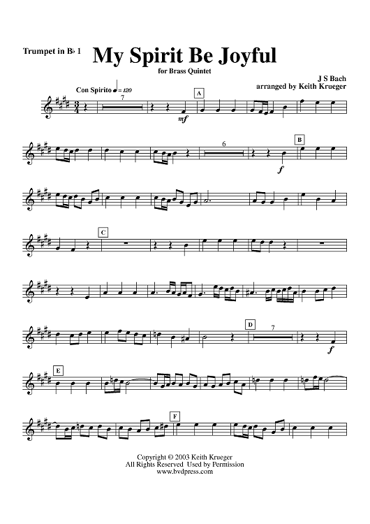 Digital Sheet Music for My Spirit Be Joyful - Trumpet 1 by Keith Krueger, Johann Sebastian Bach scored for Brass Quintet; id:312375