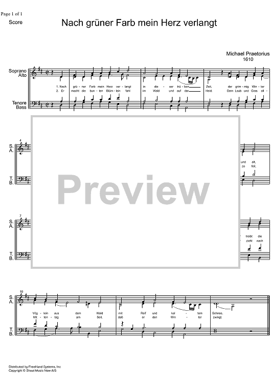 Digital Sheet Music for Nach grüner Farb Herz verlangt by Michael Praetorius scored for SATB Choir; id:325880
