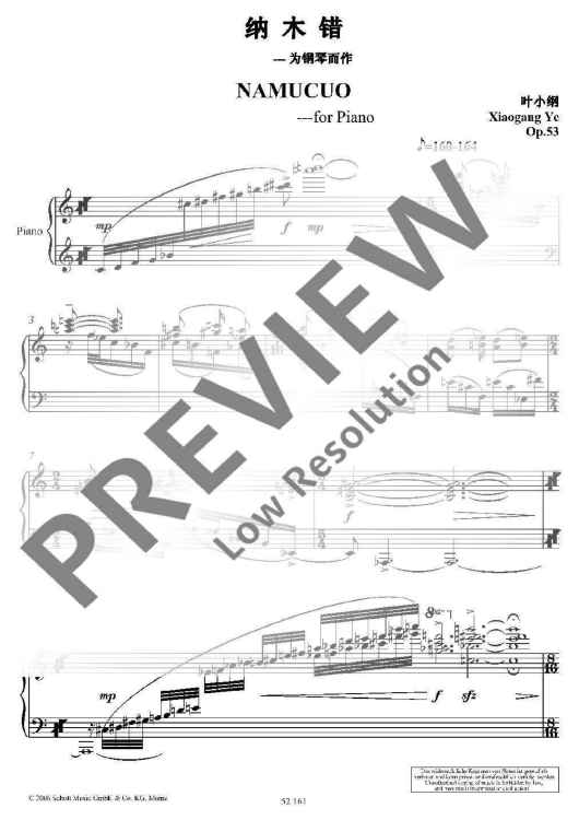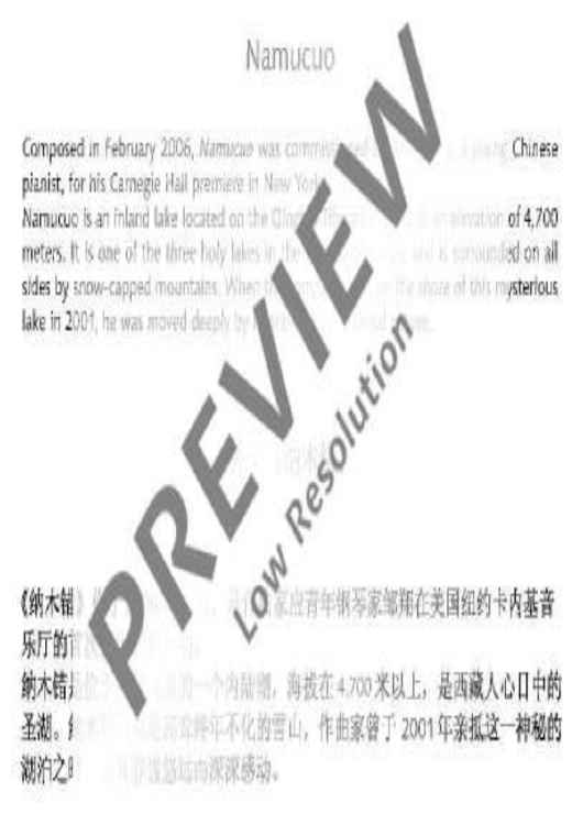 The Chinese Ye Xiaogang is one of the most prominent and successful composers of his country and his generation and is at the same time a brilliant pianist. His music is an unmistakable blend of Eastern and Western traditions. This can also be felt in this one-movement piano piece the title of which refers to the name of a lake in Tibet. To paint the unmistakable atmosphere of this landscape in terms of music, Ye uses short peaceful motifs that alternate with sparkling tremolos and ascending and descending sound cascades. The softly fading end in the upper register leaves the impression of silence and loneliness. A virtuoso and effective piece for the piano!