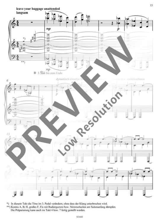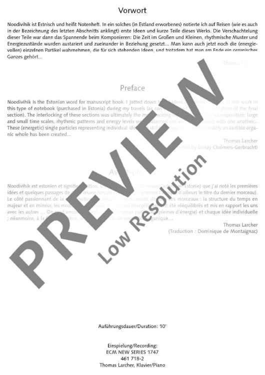 Noodivihik deals with time on a macro and a micro level. The macro time level is divided into two parts: fast and slow. The first part (‘citric acid’) works with two basic rhythmic patterns and their irritation through the addition or subtraction of note values. The interweaving of the two sectors, in which these basic patterns appear separately, results in a structure of the time in the middle (that is, within 'critic acid').The second part ('leave your baggage unattended') combines the aforementioned two levels through the superimposition of natural and prepared tones on the piano. This all occurs within a three-layered, endless pattern. (Thomas Larcher)