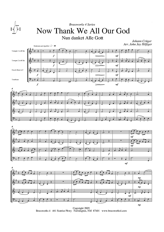 Digital Sheet Music for Now Thank We All Our God - Score by Johann Crüger, John Jay Hilfiger scored for Brass Quartet; id:316714