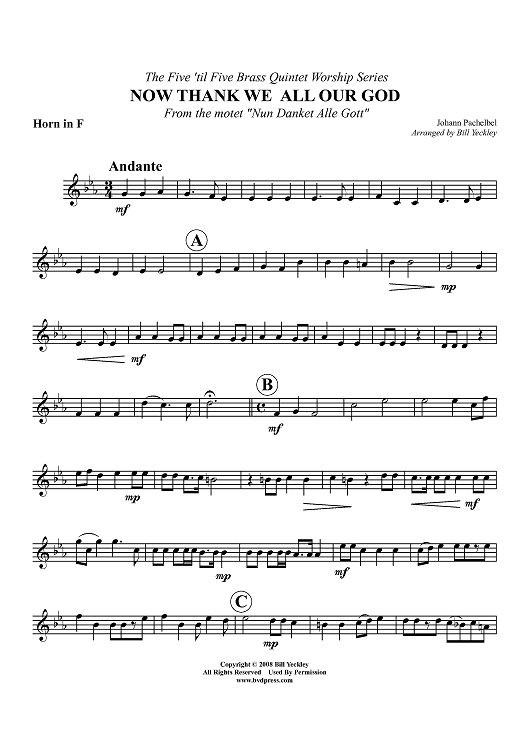 Digital Sheet Music for Now Thank We All Our Lord - Horn in F by Johann Pachelbel, Bill Yeckley scored for Brass Quintet; id:428133