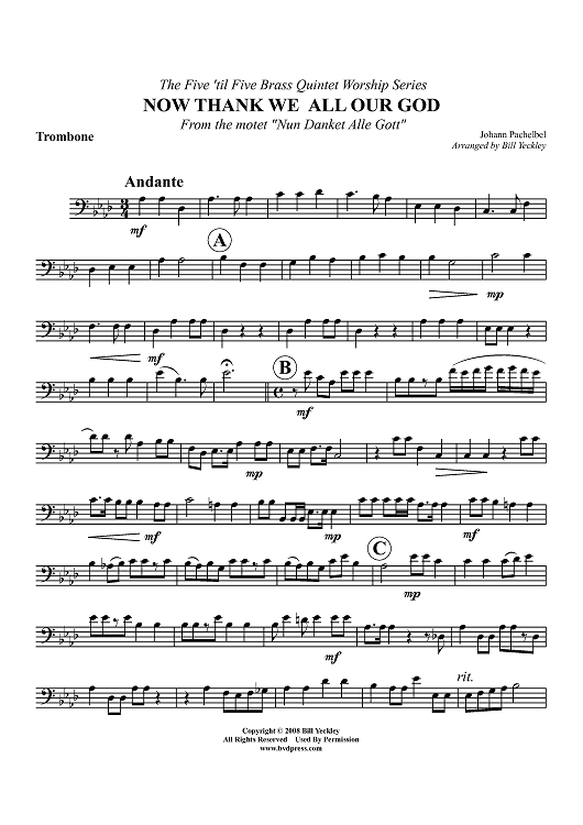 Digital Sheet Music for Now Thank We All Our Lord - Trombone by Johann Pachelbel, Bill Yeckley scored for Brass Quintet; id:428134