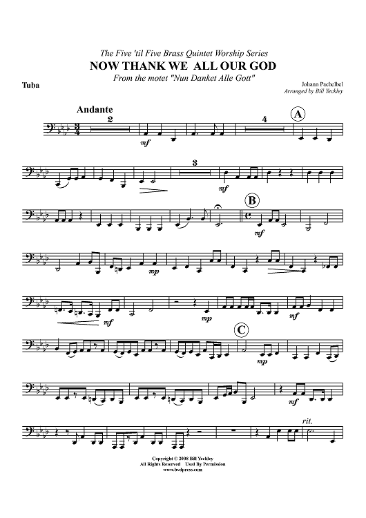 Digital Sheet Music for Now Thank We All Our Lord - Tuba by Johann Pachelbel, Bill Yeckley scored for Brass Quintet; id:428135