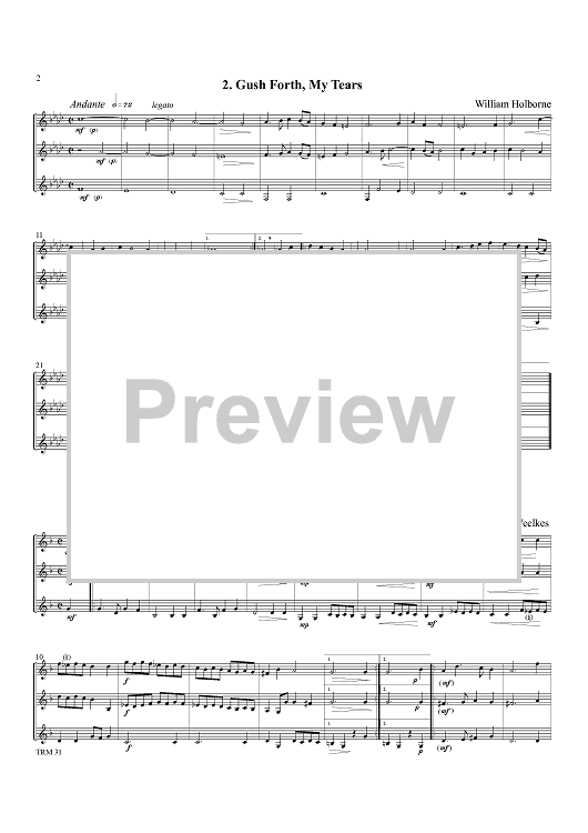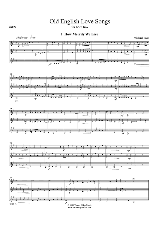 Six trios from English renaissance masters Morley, East, Weelkes, etc. Perfect for seasonal party music! 1. How Merrily We Live 2. Gush Forth, My Tears 3. Late in My Rash Accounting 4. If My Complaints 5. Though Philomela Lost Her Love 6. As Fair as Morn