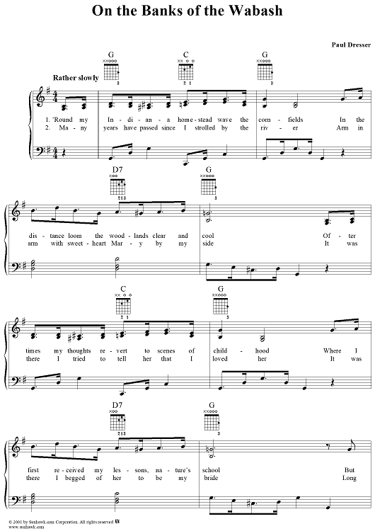 Digital Sheet Music for On the Banks of the Wabash by Paul Dresser scored for Piano/Vocal; id:271297