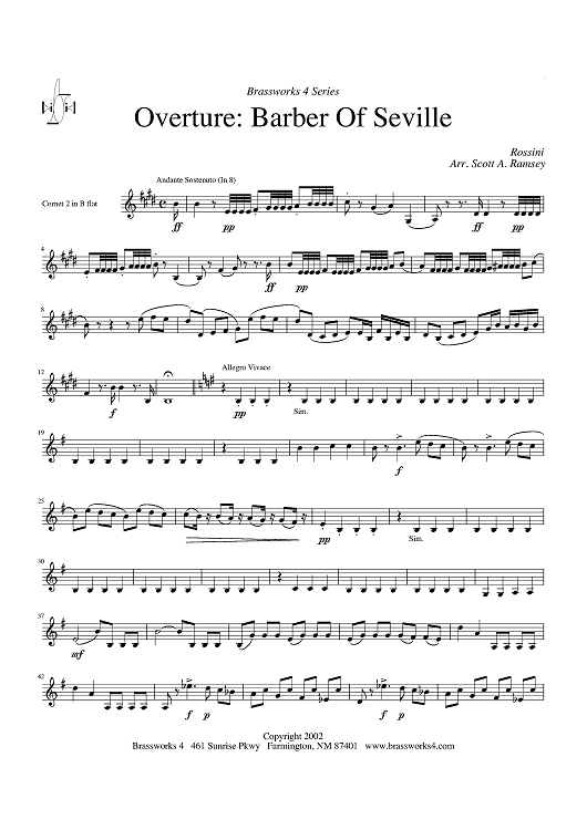 Digital Sheet Music for Overture: Barber of Seville - Cornet 2/Trumpet 2 by Gioachino Rossini, Scott A. Ramsey scored for Brass Quartet; id:316485