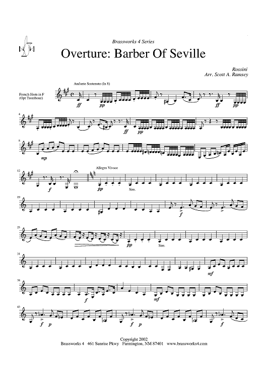 Digital Sheet Music for Overture: Barber of Seville - Horn in F by Gioachino Rossini, Scott A. Ramsey scored for Brass Quartet; id:316487