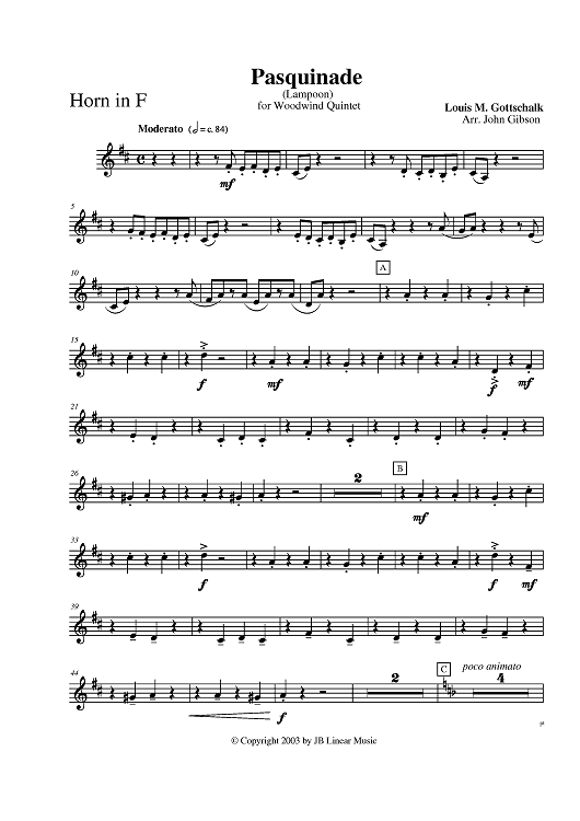 Digital Sheet Music for Pasquinade (Lampoon) - Horn in F by Louis Moreau Gottschalk, John Gibson scored for Woodwind Quintet; id:423868
