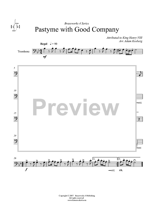 Digital Sheet Music for Pastyme with Good Company - Trombone by Henry VIII, Adam Kosberg scored for Brass Quintet; id:363487