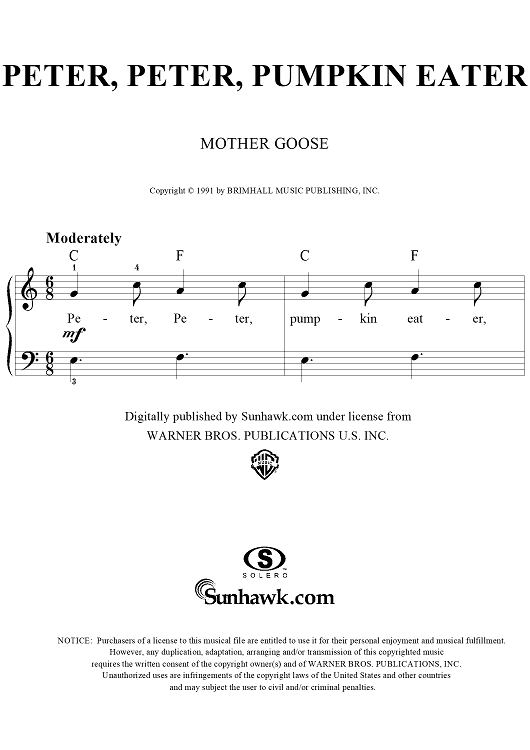 "Peter, Peter, Pumpkin Eater" Sheet Music by Mother Goose