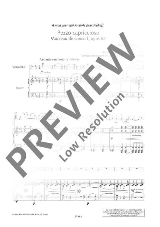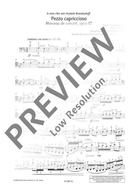Apart from the famous Rococo Variations, Pyotr I. Tchaikovsky composed another work for solo violoncello: Pezzo capriccioso, Opus 62. It is dedicated to Brandoukoff (Brandukov) with whom he had performed this little virtuoso piece for the first time at the famous salon of the Benardaky family in February 1888. The soloist himself suggested a few minor changes in the solo part. Even Maurice Gendron, the great cello virtuoso and teacher, attended to the work once again, not only 'bedighting' the solo part in a virtuoso manner but also adding a cadenza, an extended recapitulation and a lengthened ending to the Pezzo. The present edition enables the performer to get an accurate picture of the different versions and layers. The fingerings, bowing indications and interpretational aids - except for in the added parts - are by Maurice Gendron.