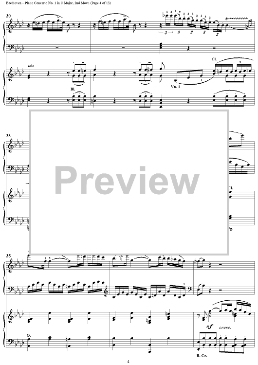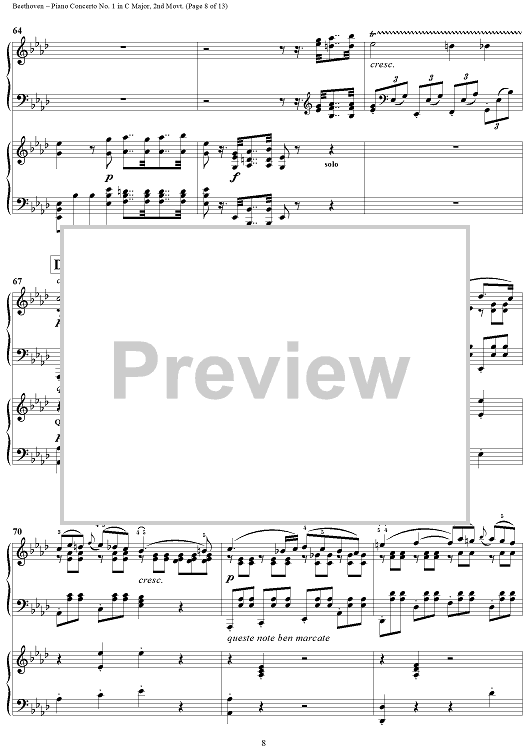 Digital Sheet Music for Piano Concerto No. 1 in C Major, Op. 15, Mvmt. 2 by Ludwig van Beethoven scored for 2 Pianos, 4 Hands; id:404502