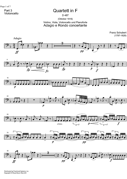 "Piano Quartet F Major D487 - Cello" Sheet Music by Franz Schubert