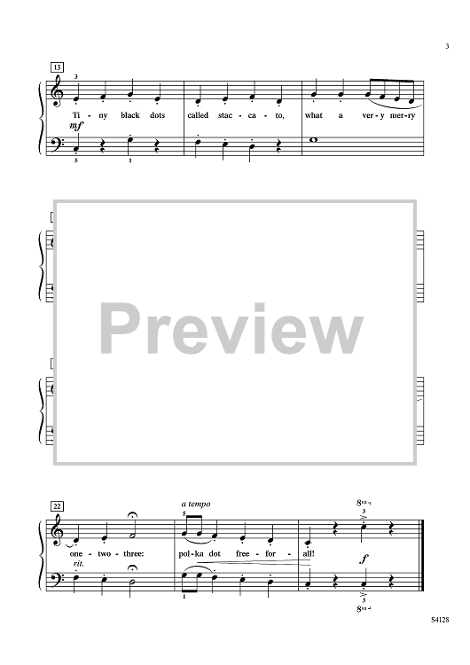 A perfect vehicle to successfully teach elementary students how to play staccato notes, Polka Dot Notes highlights staccato playing in a clever, artistic context. This piece will serve well as an elementary etude and repertoire supplement. The humorous lyrics and bouncy music promises to be especially appealing to young students.