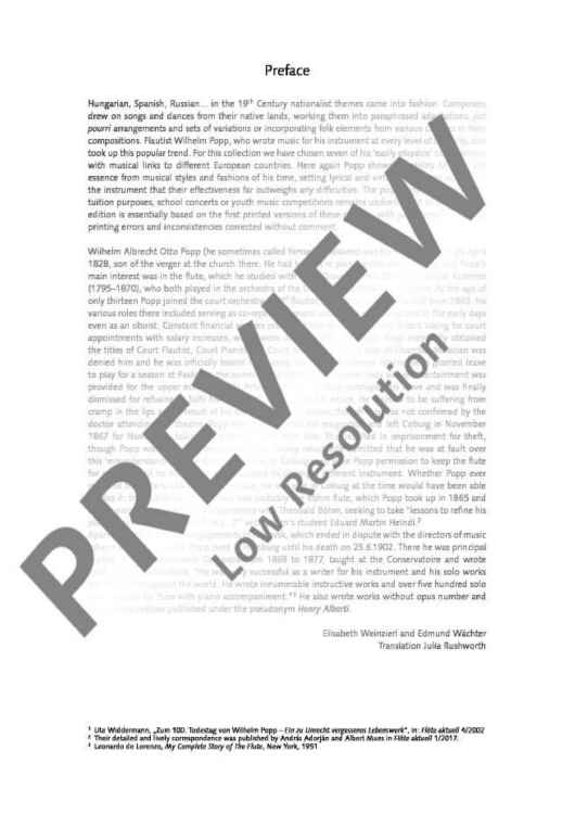 In the 19th Century nationalist themes came into fashion. Composers drew on songs and dances from their native lands, working them into paraphrased adaptations, pot pourri arrangements and sets of variations or incorporating folk elements from various cultures in their compositions. Flautist Wilhelm Popp (1828-1902), who wrote music for his instrument at every level of difficulty, also took up this popular trend. In this collection seven of his ‘easily playable’ compositions have been chosen with musical links to different European countries. Here again Popp shows his ability to distil the essence from musical styles and fashions of his time, setting lyrical and virtuoso passages so well for the instrument that their effectiveness far outweighs any difficulties. The popularity of his pieces for tuition purposes, school concerts or youth music competitions remains undiminished to this day. This edition is essentially based on the first printed versions of these pieces – with just a small number of printing errors and inconsistencies corrected without comment.