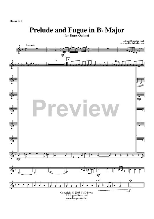 Digital Sheet Music for Prelude and Fugue in B-flat Major - Horn by John Beyrent, Johann Sebastian Bach scored for Brass Quintet; id:312914