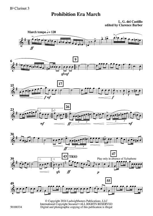 Digital Sheet Music for Prohibition Era March - Bb Clarinet 3 by Clarence Barber, Lloyd Gould del Castillo scored for Concert Band; id:503845