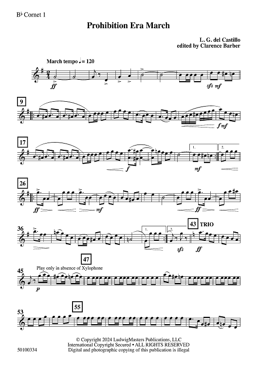 Digital Sheet Music for Prohibition Era March - Bb Cornet 1 by Clarence Barber, Lloyd Gould del Castillo scored for Concert Band; id:503851