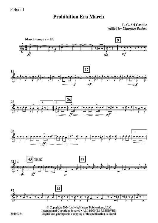 Digital Sheet Music for Prohibition Era March - F Horn 1 by Clarence Barber, Lloyd Gould del Castillo scored for Concert Band; id:503854